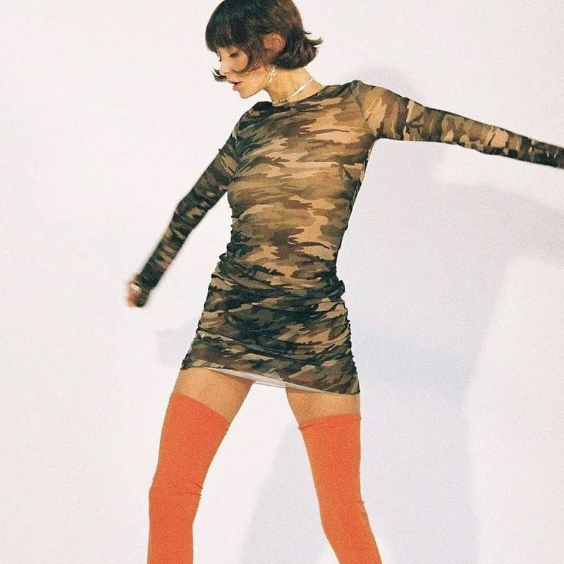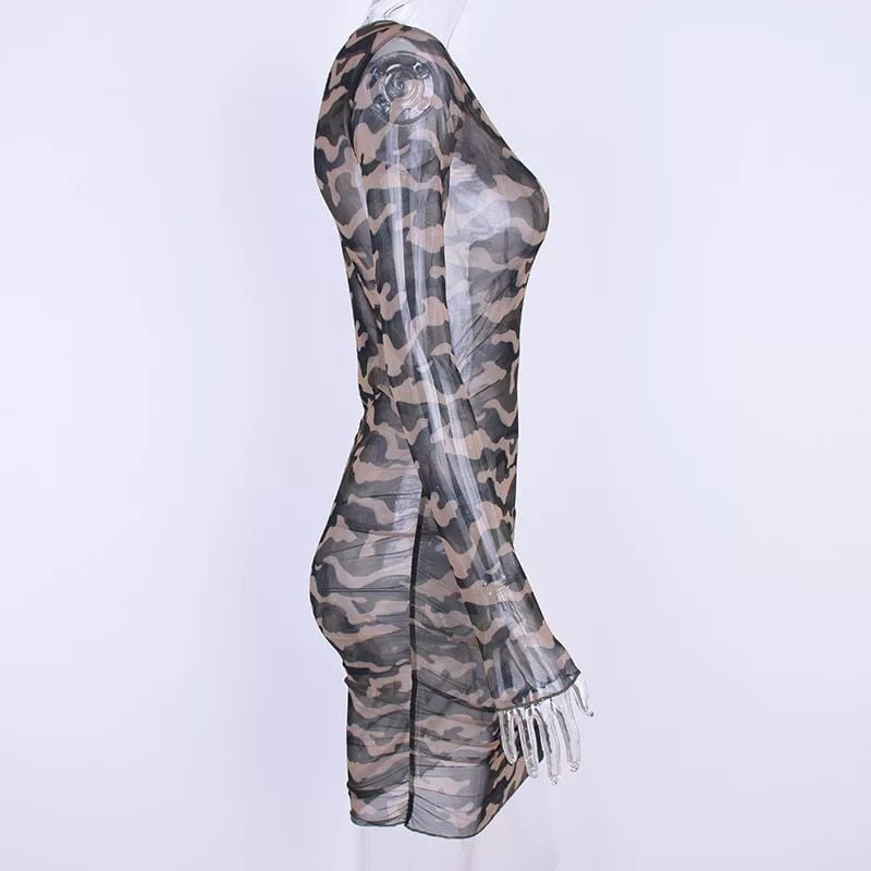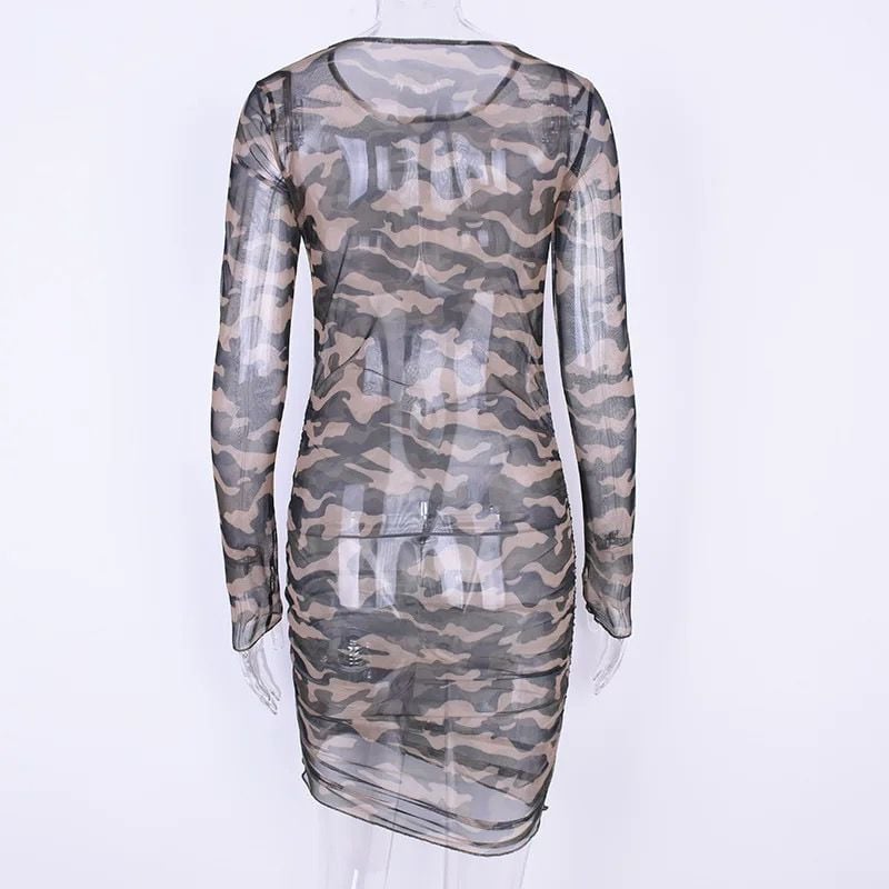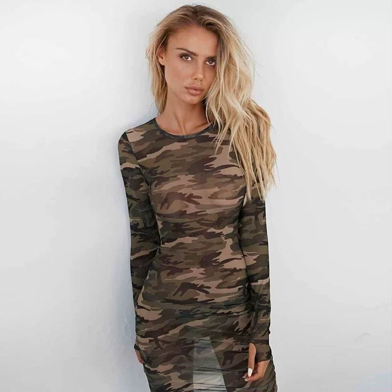 Step into the spotlight with our Camouflage High Elastic Print Translucent Mesh Dress, the ultimate blend of style and comfort. This stunning dress features a unique camouflage pattern that sets you apart from the crowd while giving you a chic and modern look. Crafted from matel silk fabric, this dress provides a soft touch against your skin, ensuring you feel as good as you look.